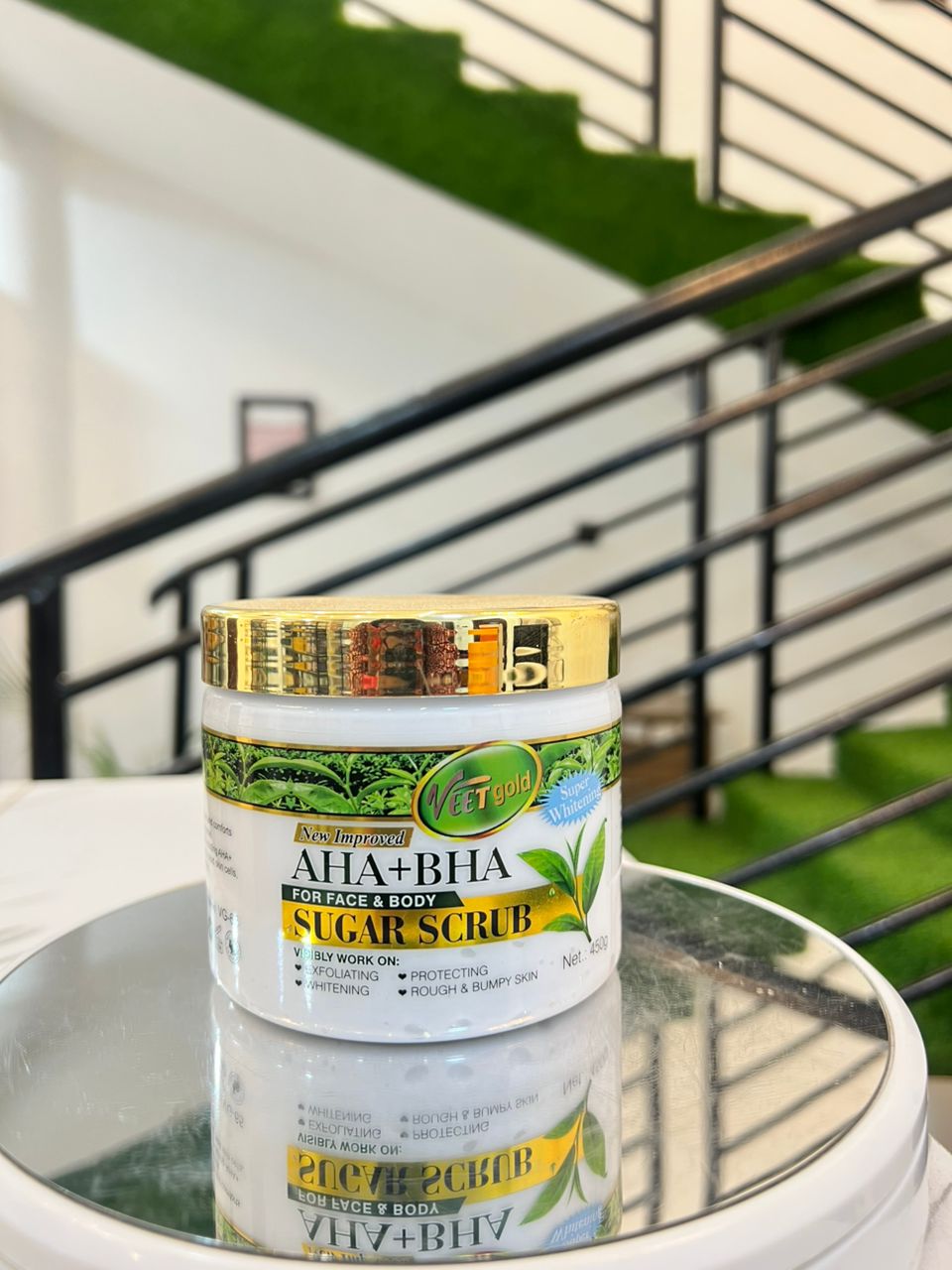 Veet Gold Alpha+BHA Sugar Scrub. Visibly work on: exfoliating, protecting, whitening, rough and bumpy skin